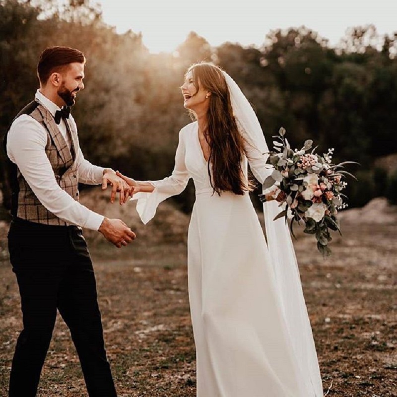 Long Sleeve Chiffon Wedding Dress V Neck Bridal Gown Custom Size
