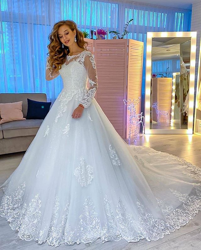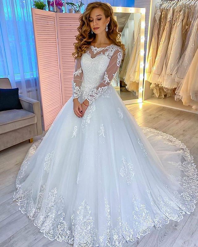 Princess Lace Long Sleeve Wedding Dress,Elegant White Bridal Gown with Train