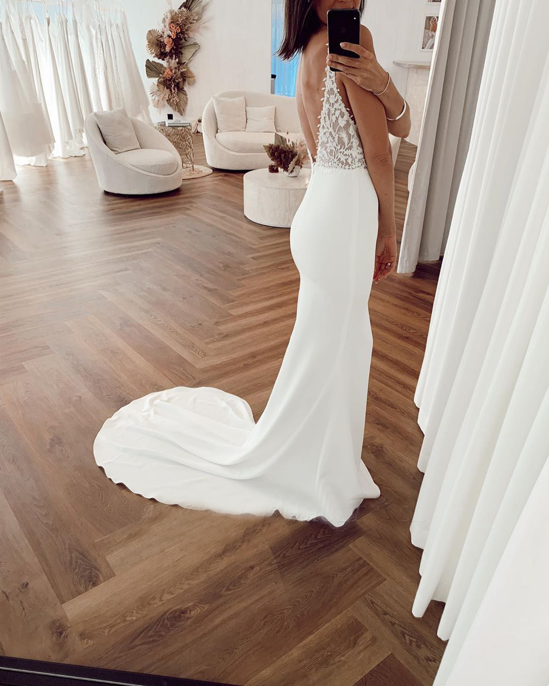 Spaghetti Straps Deep V-neck Sheath Wedding Dresses,Sexy Backless Lace Appliques Bridal Gowns