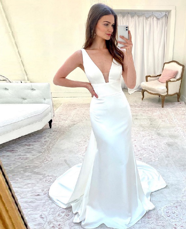 Simple Sheath Wedding Dress,V-neck Wedding Gown,Sexy Back Open Wedding Dress