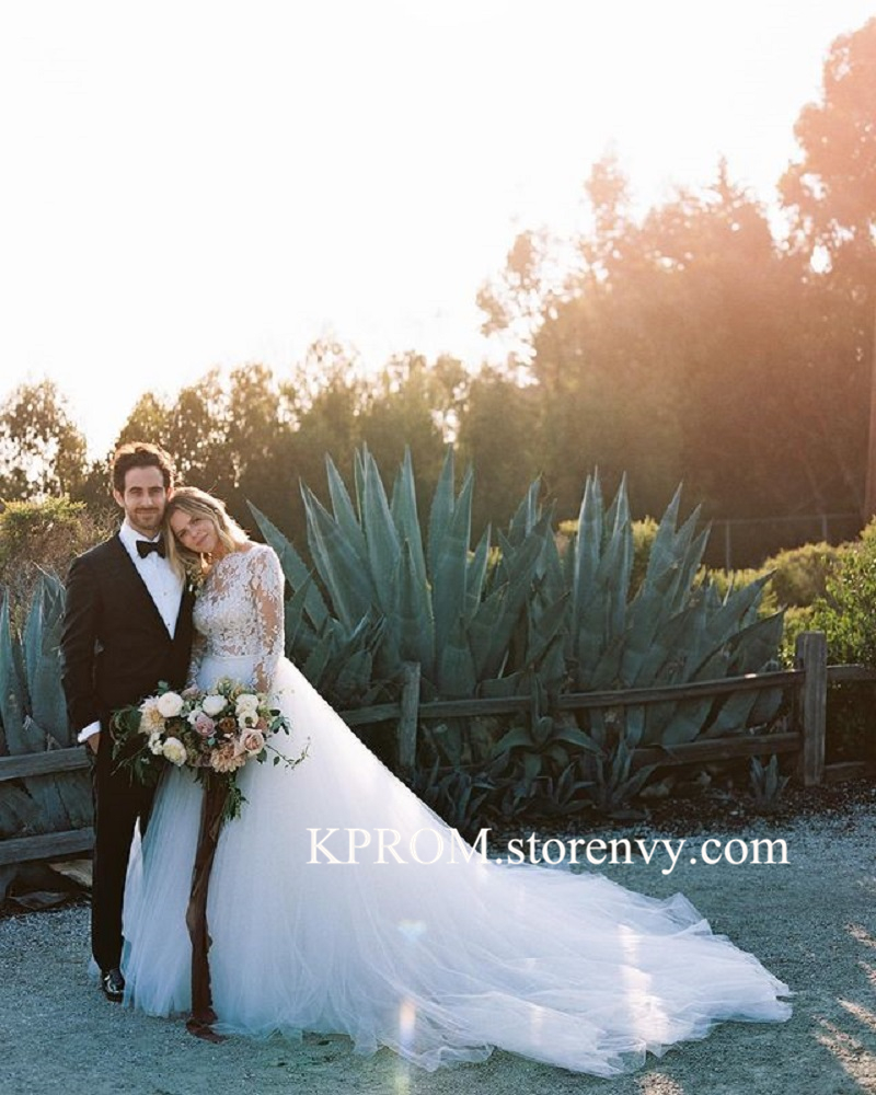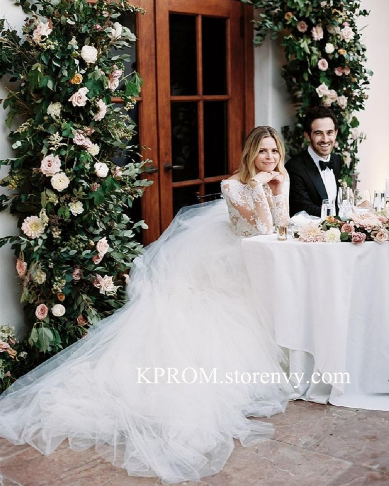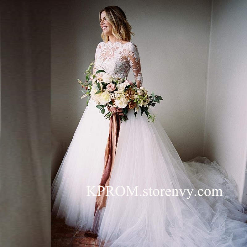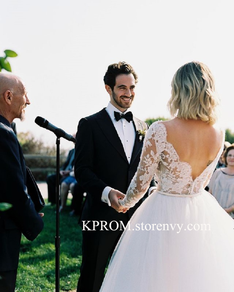 Modest Wedding Dresses with Long Sleeves,Ball Open Lace Women Bridal Gown with Court Train