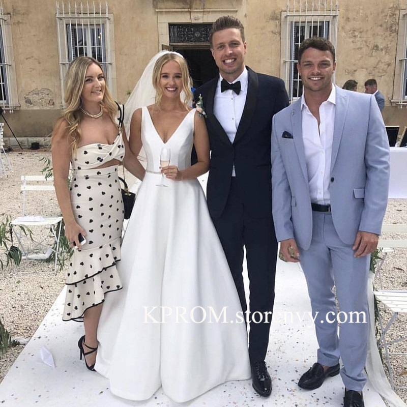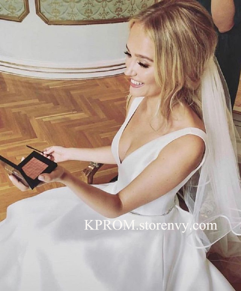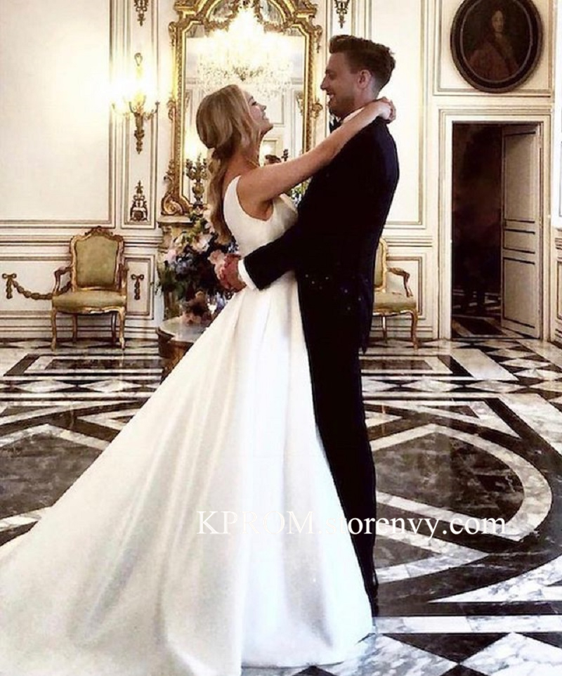 Cheap Long Satin Wedding Dresses,White A-line V Neck Back Open Wedding Gowns with Train