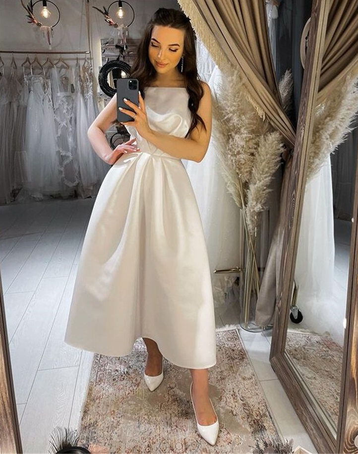 Simple Satin A Line Wedding Party Dresses Spaghetti Straps Pleats Tea Length Bride Gowns