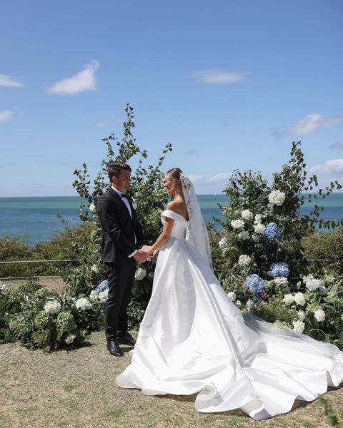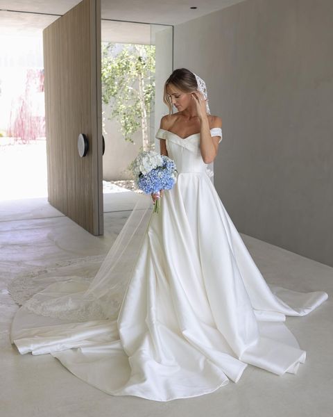 Modern White Satin Wedding Dresses with Train,Custom Off Shoulder Wedding Gowns