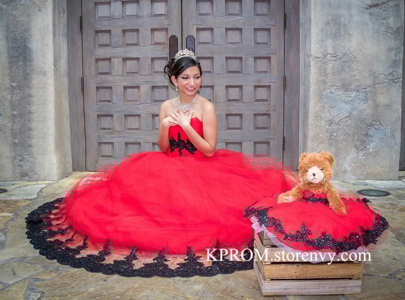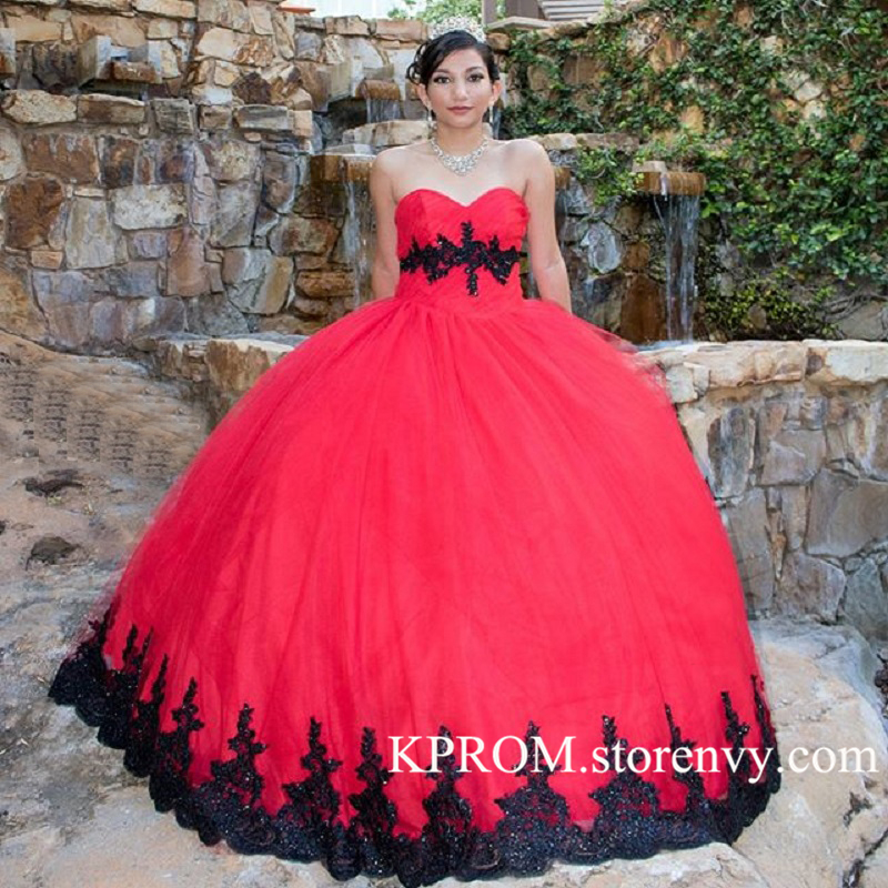 Red Ball Gown Quinceanera Dress Floor-length Sweet 16 Dress Debutante Gowns with Black Lace
