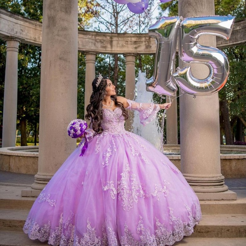 Princess Lavender Quinceanera Dresses V Neck Lace Up Ball Gown Sweet 16 Dress Lace Long Sleeves Prom Gown