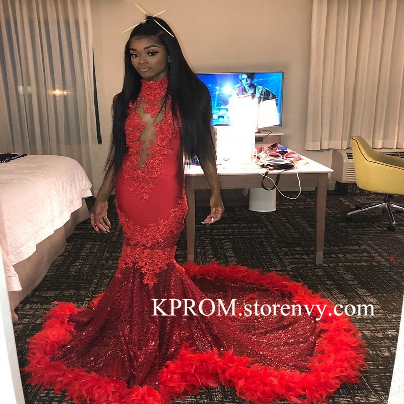 Red Feather Mermaid Black Girls Prom Dresses New Court Train High Neck Open Back African Women Evening Party Gowns