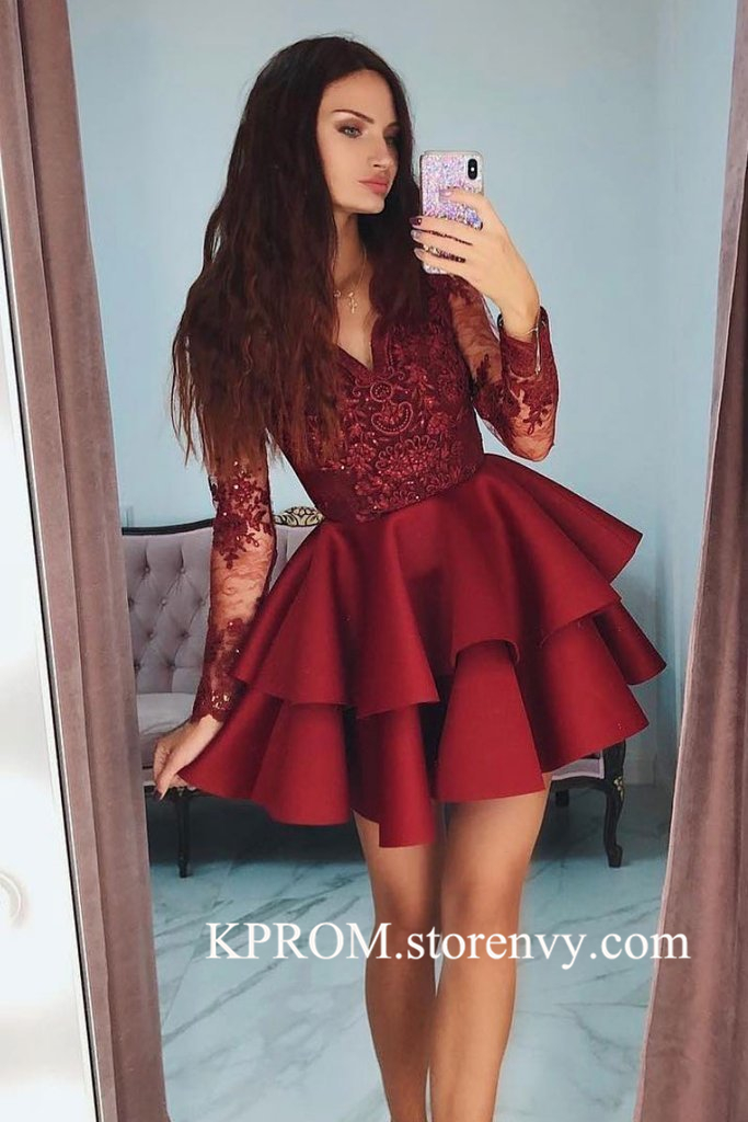 Vintage long sleeve short prom dresses,Lace Semi Formal Dress,Cocktail Dresses,Tiered Party gown for Women