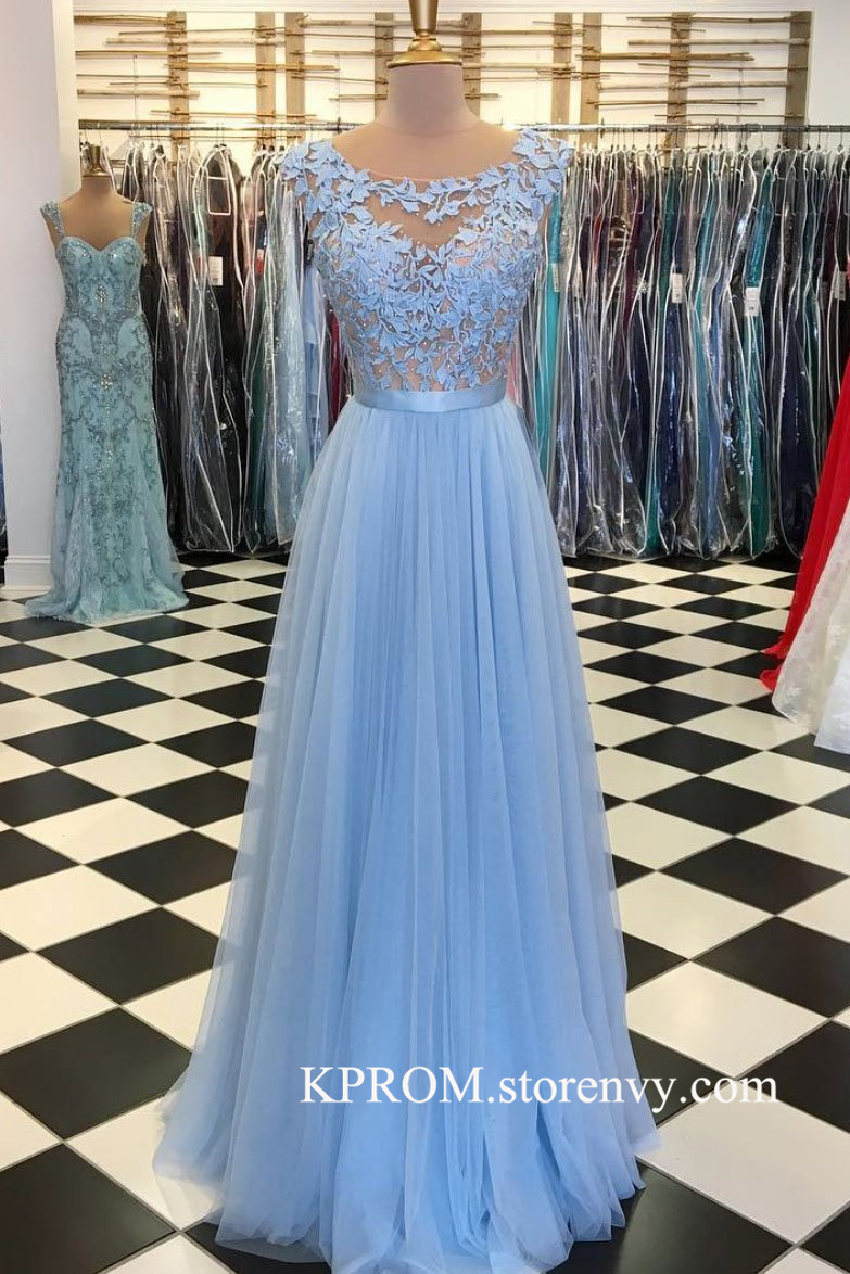 BLUE ROUND NECK TULLE LACE APPLIQUE LONG PROM DRESS,LONG BRIDESMAID DRESS,PARTY GOWNS
