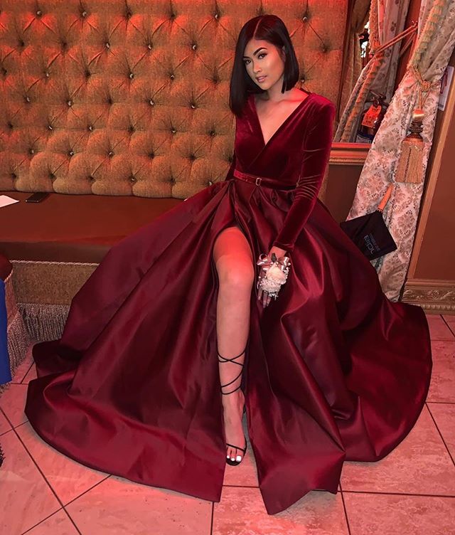 Vintage Burgundy Long Sleeve Velvet and Satin Prom Dresses Sexy Slit Formal Party Dress