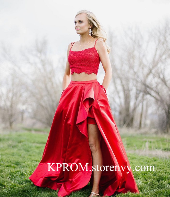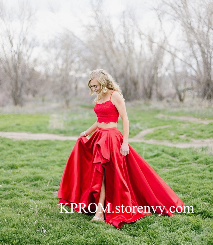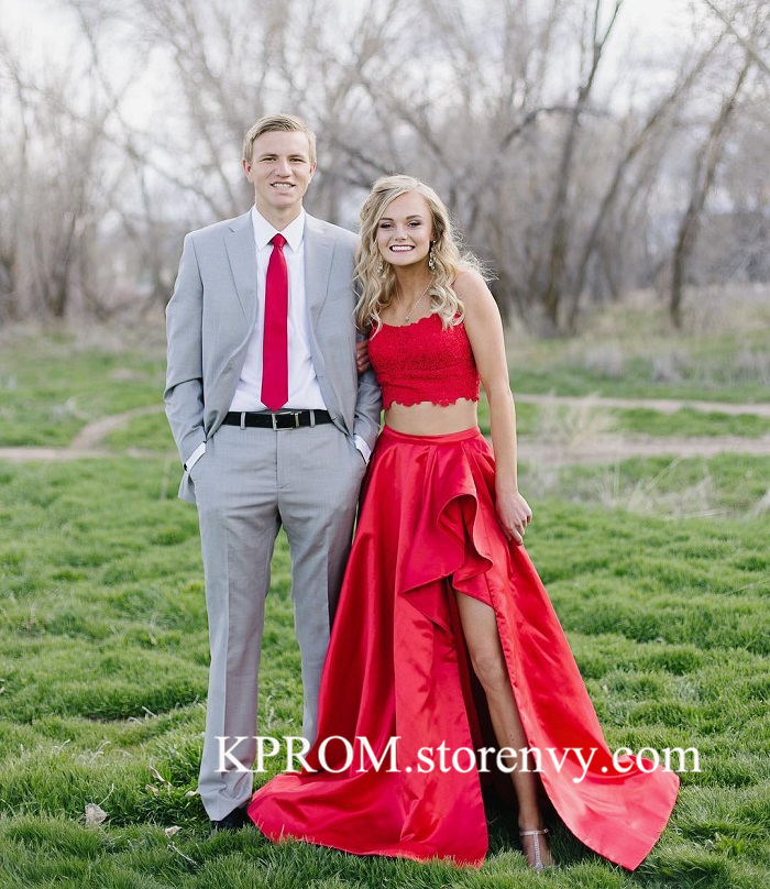 Red Prom Dresses,Side Slit Lace Applique Satin Prom Dress,Evening gown