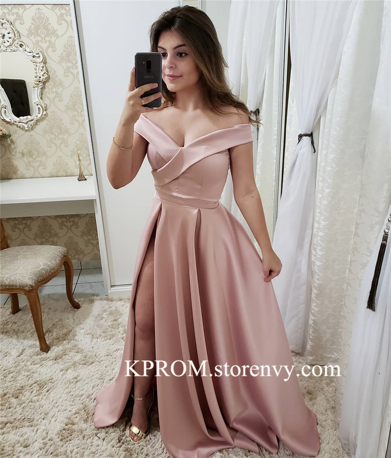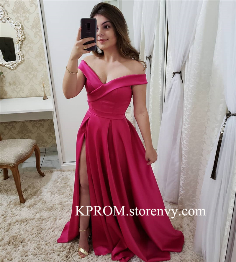 Simple A-Line Off Shoulder Backless Red/Blue/Pink Satin Long Prom/Evening Dress with Split-Front