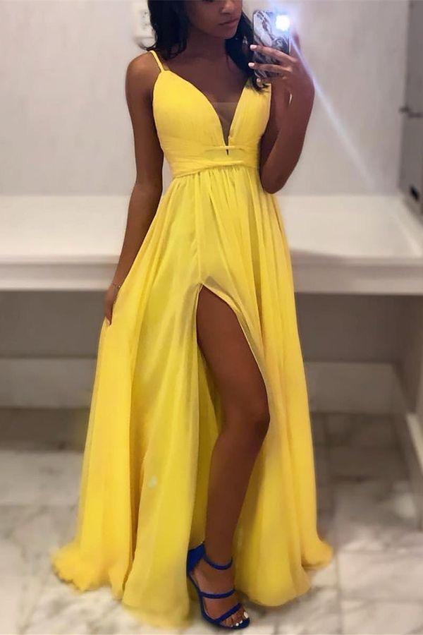 SPAGHETTI STRAPS YELLOW PROM DRESSES WITH SPLIT SIDE WITH BOW KNOT