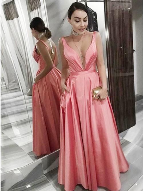 A-Line V-Neck Sleeveless Pink Satin Prom Dress with Pockets,coral evening gowns
