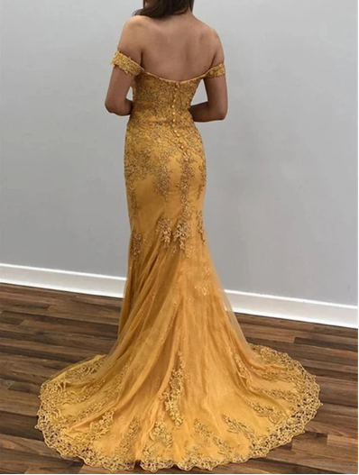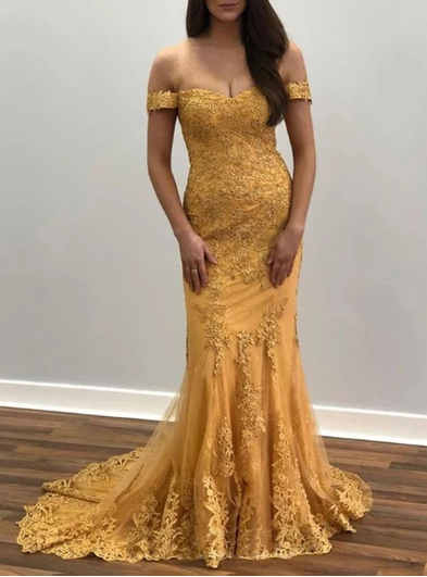 Off Shoulder Lace Appliques Mermaid Prom Dresses Gold Evening Dress