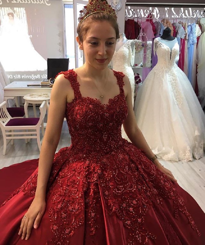 New Elegant Burgundy Lace Beaded Prom Dress,Ball Gown Long Train Formal Dresses,Quinceanera Dresses