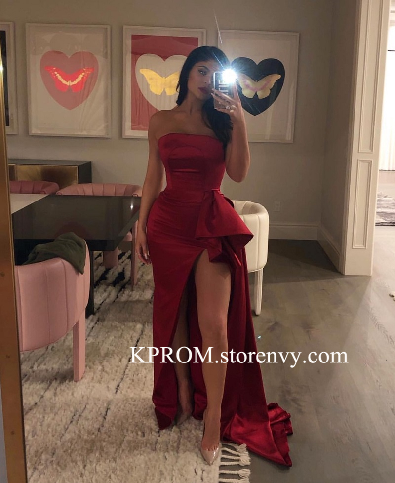 Burgundy Long Sexy Strapless Satin Split Prom Dress,Back Open Formal Evening Dresses