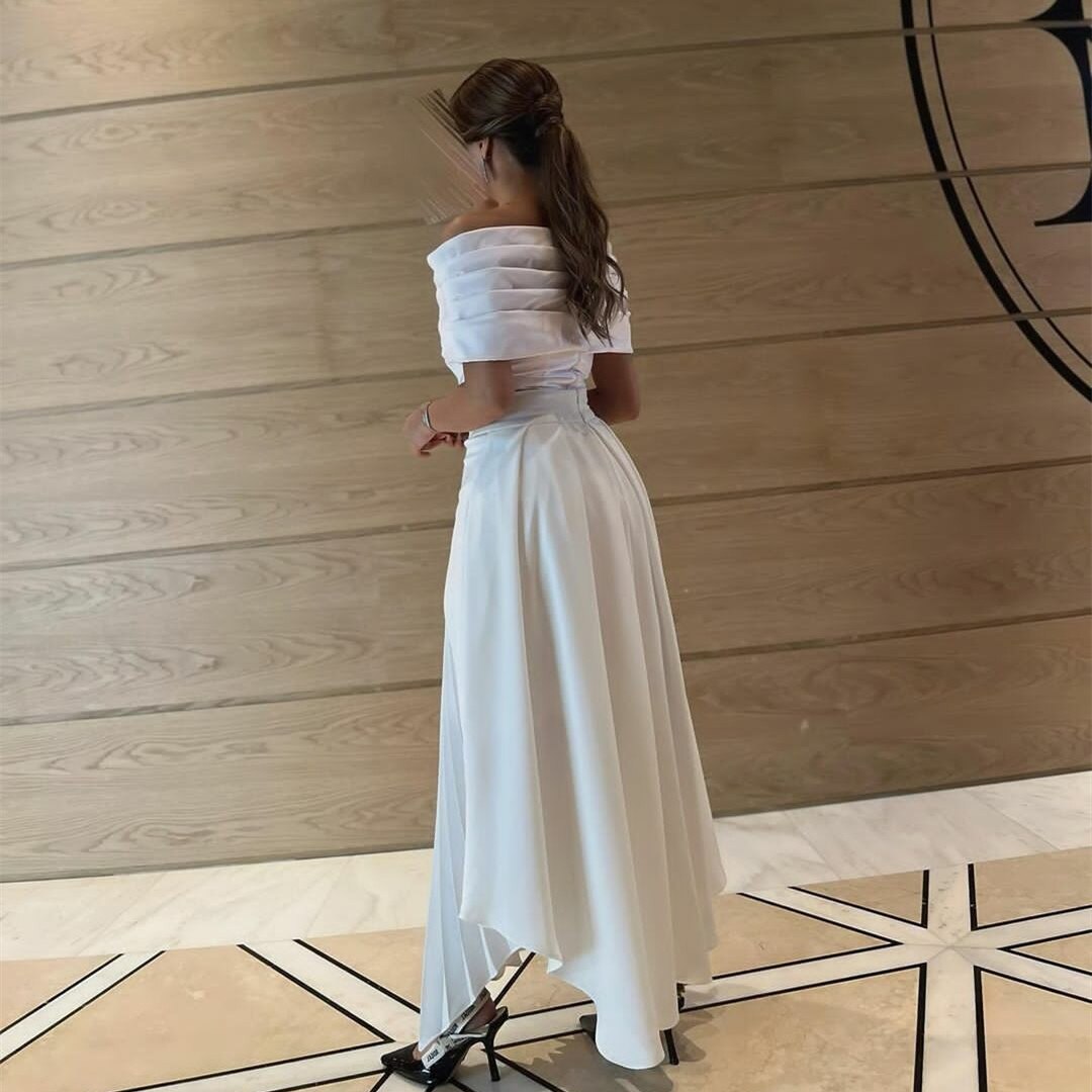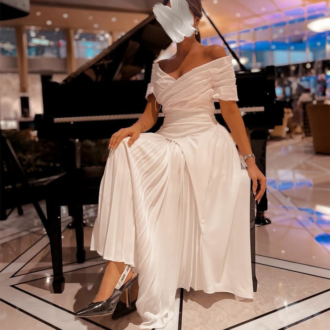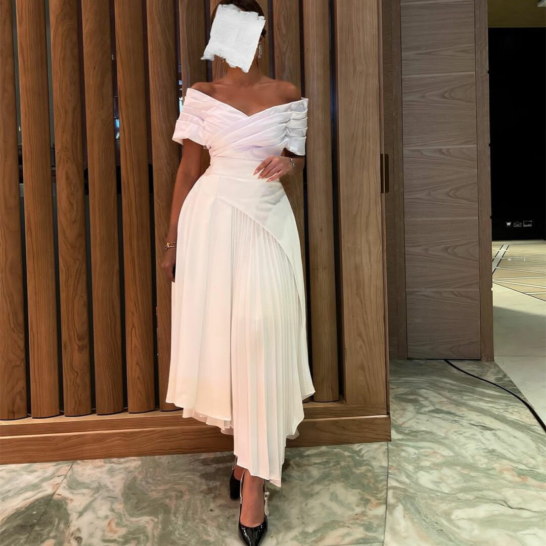 White Off Shoulder Evening Dresses,A-Line Pleated Tea Length Party Holiday Dress