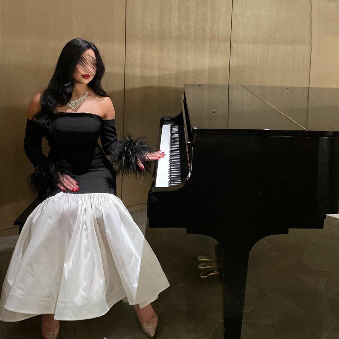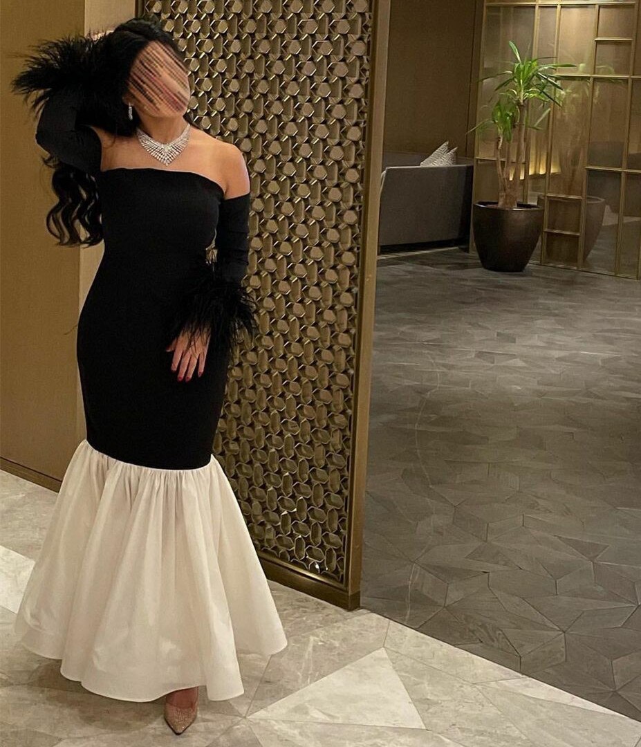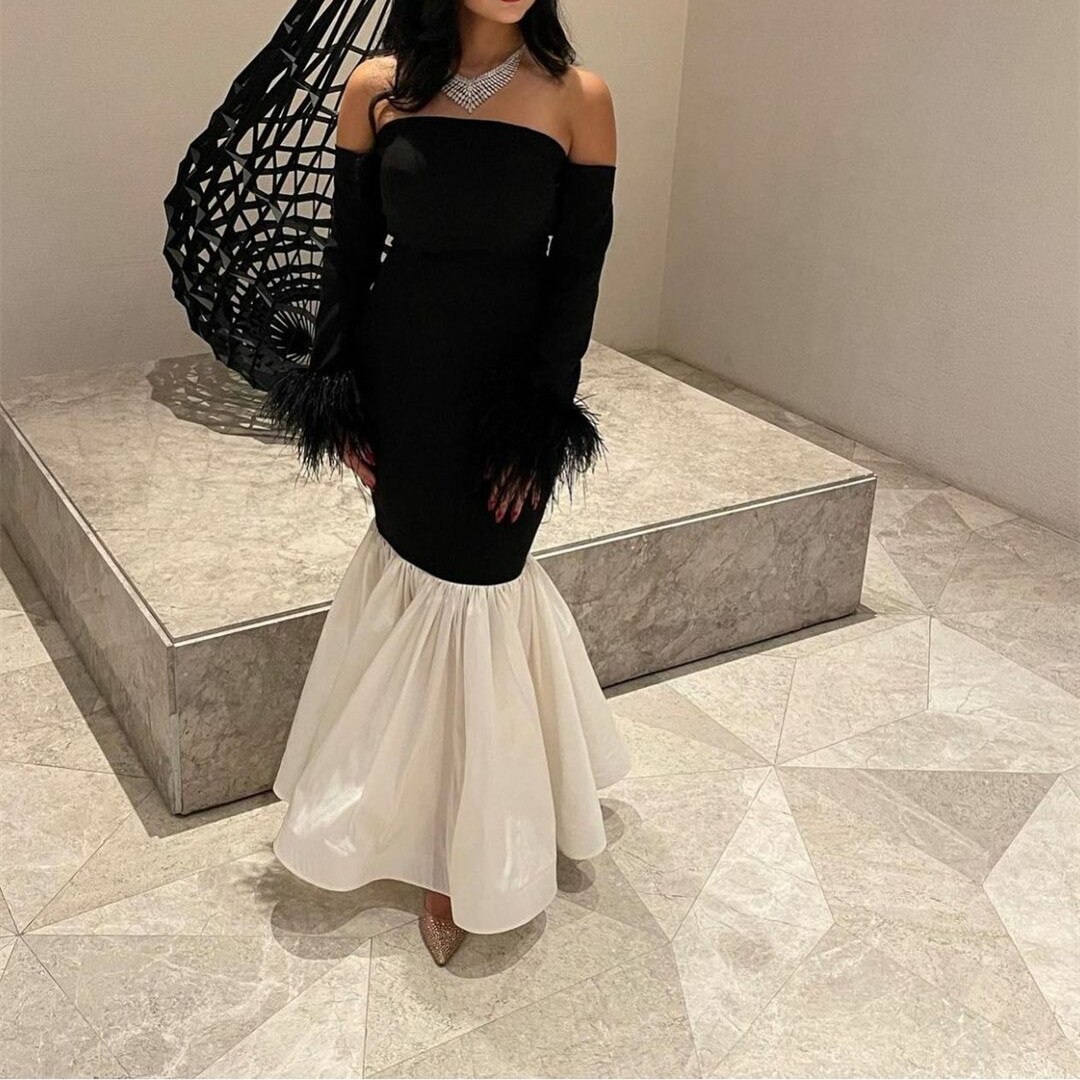 Classic Long Sleeve Crepe Evening Dresses With Feathers,Mermaid Floor Length Prom Dress for Women